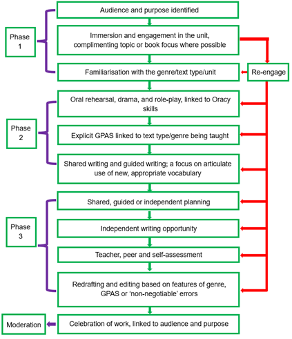 Pupils experience a wide range of purposeful genres before leaving primary school, ensuring breadth and depth in their writing. We believe writing is a craft that grows through purposeful practice and clear progression, so our English Teaching Sequence guides children from rich text immersion and discussion to oral rehearsal, shared writing, and finally independent ‘destination writing’ for a real audience. Teachers first begin by using the Long-Term Planning Grid to determine their Writing Unit Plans – ensuring objectives are mapped and covered across the year. An example of a Writing Unit Plan can be found here.