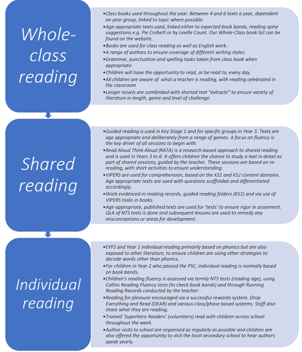 We promote a culture of reading, not simply as a life skill, but to also develop in pupils a love of books and literature that will not only support their learning across the curriculum, but also enrich their lives. We believe that the understanding and intelligent use of English is the cornerstone of a child’s education; we strive to engage pupils through an ever increasing amount of ‘reading for pleasure’ initiatives, working with parents to ensure children are reading high-quality texts on a daily basis. Our range of Reading for Pleasure initiatives can be found on our Reading for Pleasure offer found here. As children move through the school, they will improve their comprehension ability through direct teaching of VIPERS which are linked to the KS1 and KS2 content domains, via both guided reading and our Read Aloud Think Aloud shared reading approach. These are built into lessons weekly and increase in difficulty as children move through the school. For more information on the planning of reading, click here to see one of our Reading Unit Plans.